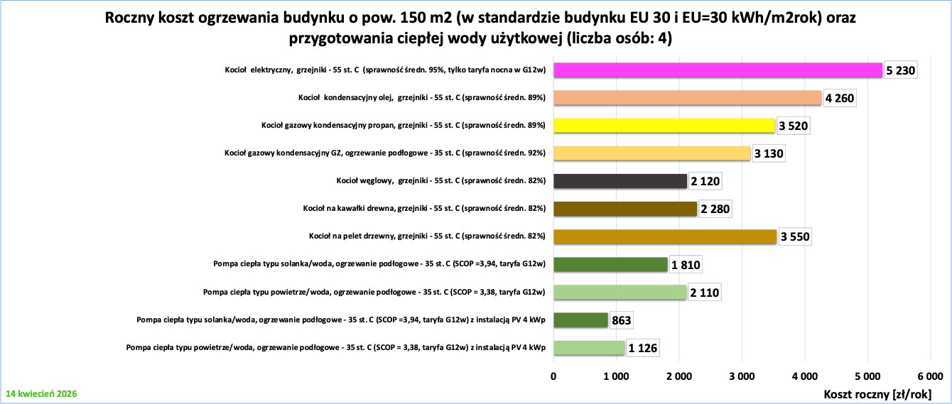 Rys. 2. Przykładowe roczne koszty ogrzewania budynku jednorodzinnego o powierzchni 150 m², o zapotrzebowaniu na energię użytkową do ogrzewania EU 80 kWh/(m²·rok), wraz z kosztem przygotowania ciepłej wody użytkowej dla 4-osobowej rodziny. Dane uwzględniają koszty energii w II kwartale 2026 r.